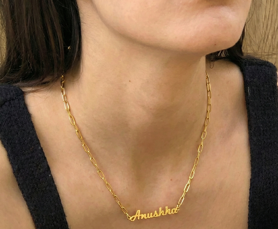 This personalized necklace is a versatile accessory that can be styled to suit any look. Its distinctive script makes it a standout piece on its own, perfect for wearing as a personal statement. The necklace sits comfortably at the collarbone, ideal for pairing with both casual and formal attire.