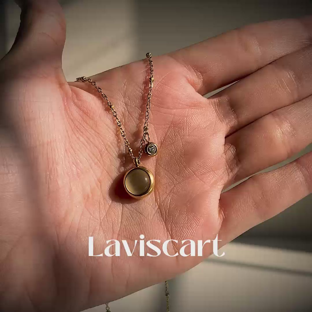 Effortlessly chic and timeless, this 18k gold-plated necklace features a round, polished gemstone pendant paired with a sparkling zircon charm. The combination of the soft, luminous stone and the glistening crystal creates a refined look that’s perfect for both casual and formal wear. The delicate chain is adorned with small, polished beads, adding to its whimsical elegance.