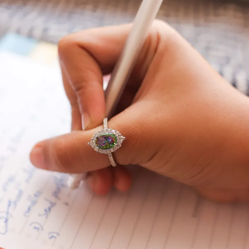 Centered around a truly captivating oval-cut Mystic Zircon, this ring exhibits a mesmerizing, kaleidoscopic play of colors with every movement. The iridescent hues — from rich purples and greens to fiery blues — create a unique, ever-changing brilliance. The magical centerpiece is framed by a brilliant halo of oval-cut zircons, a unique detail that enhances the central stone's radiance. The design is completed by a delicate, pave-set band of clear stones, ensuring continuous sparkle from top to bottom.