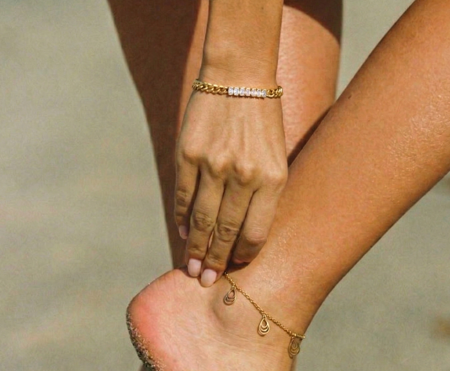 Gold anklet crafted in premium stainless steel with a polished shine. Lightweight and comfortable for everyday wear, perfect for stacking or wearing solo. Designed in a versatile 23CM length for an elegant ankle look