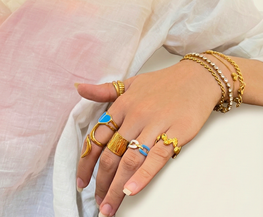 Gold adjustable ring crafted with a premium polished finish. Flexible open-band design that comfortably fits most finger sizes. Elegant detailing with a balanced height (HEIGHT - 0.7 WIDTH - 2)