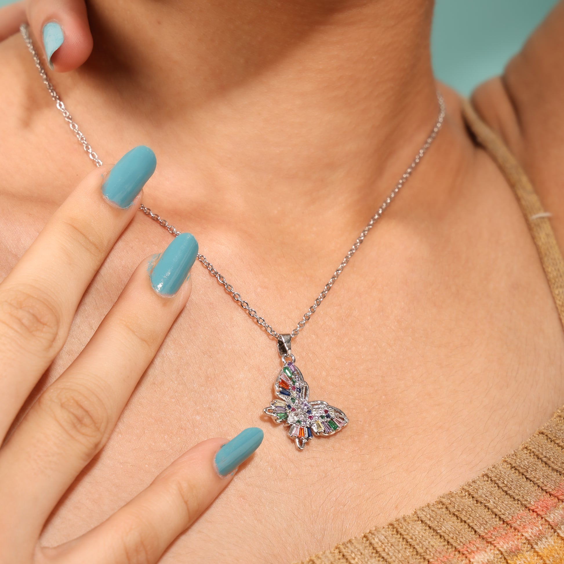 Inspired by grace and radiant beauty, this Multicolored Zircon Butterfly Necklace captures both whimsy and sophistication. The butterfly’s wings are meticulously studded with shimmering, multicolored zircon diamonds, forming a luminous mosaic that dances with light. Crafted to sit delicately on a fine silver chain, it adds a delicate sparkle to any ensemble.