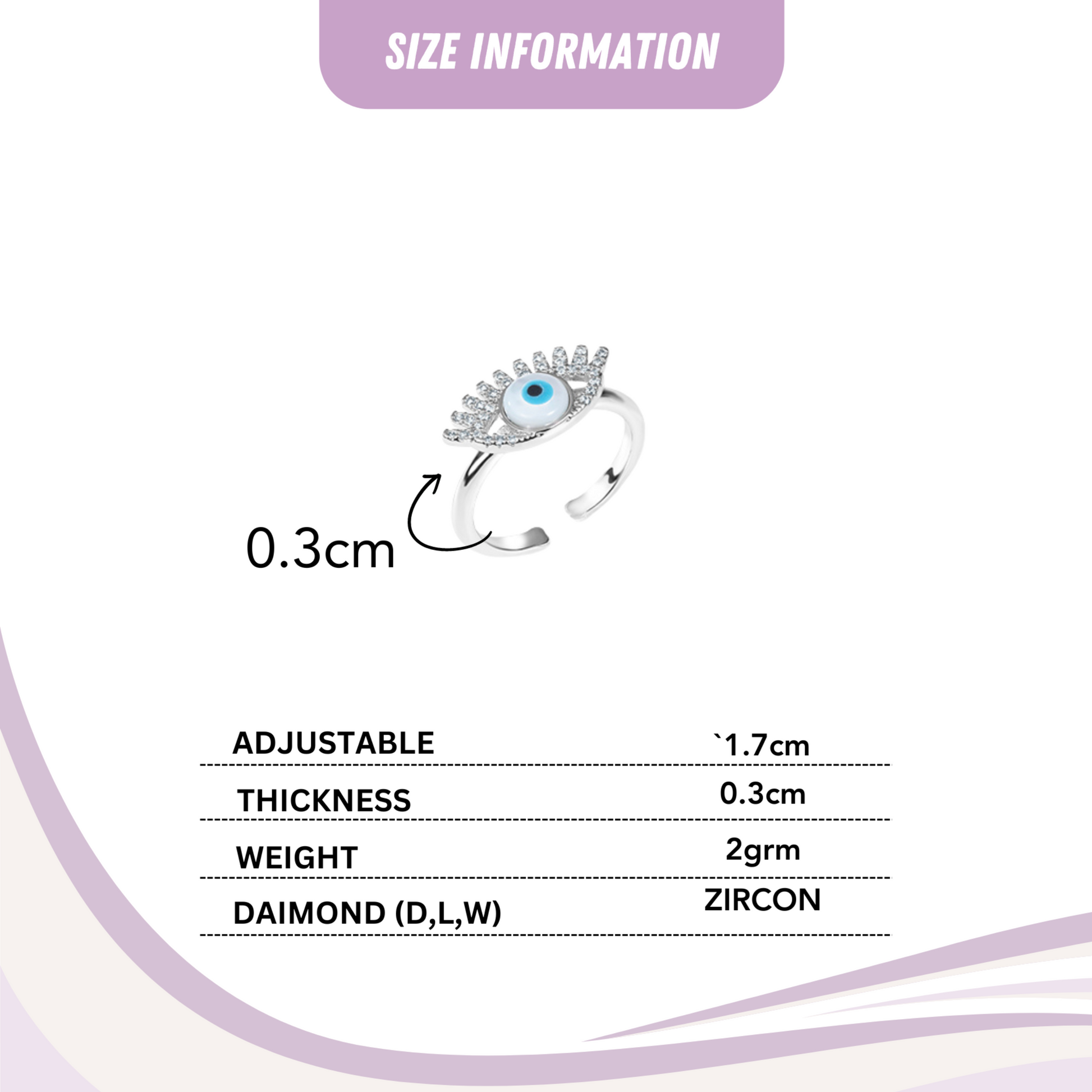 Make a statement with this captivating ring, featuring a striking evil eye motif that is both stylish and symbolic. The eye is crafted with a smooth, milky white enamel and a vibrant blue center, and is framed by a dazzling array of pave-set zircon diamonds that create a sparkling halo. This piece is a unique blend of modern design and ancient symbolism, making it an excellent choice for adding a touch of bold, artistic flair to your collection. The open, adjustable band ensures a comfortable and adaptable fit.