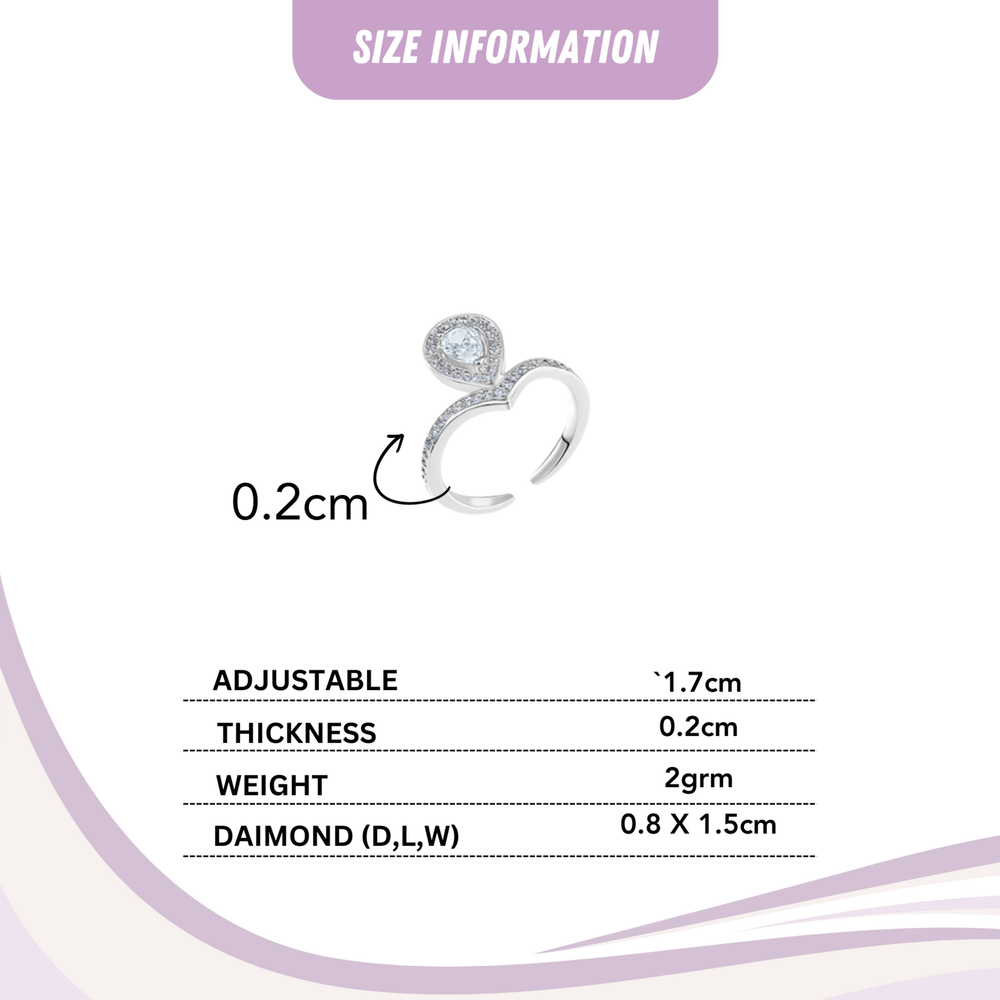 Make a stunning statement with this ring, designed to radiate pure brilliance. It features a dazzling teardrop-shaped zircon diamond at its heart, encircled by a halo of smaller, meticulously set stones that amplify its shine. The unique split shank is also lined with a trail of pave-set zircons, creating a waterfall of light that gracefully flows around the finger. This piece is perfect for those who desire a touch of classic glamour and sophisticated sparkle, offering a luxurious feel and an eye-catching design. The open band allows for an adjustable and comfortable fit.